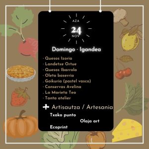 El 24 de noviembre se celebra el Mercado de Artziniega, como cada último domingo de mes, en el Frontón de Artziniega. Se podrán adquirir productos de proximidad elaborados en la comarca o en comarcas limítrofes. Una oferta de calidad donde poder degustar quesos, miel, pan, pastel vasco o embutido además de productos de artesanía local.