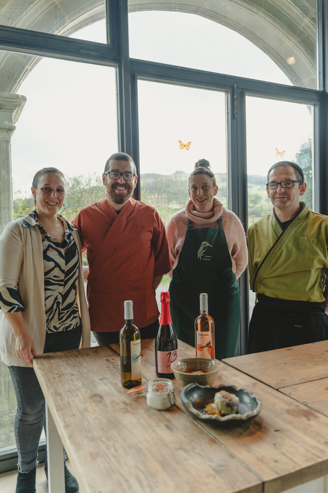 Tras descubrir los viñedos de Txakoli Txikubin de la mano de Fede Verastegui, las personas visitantes disfrutaron de los sabores de la comarca en una cata comentada con Mikel Garaizabal: