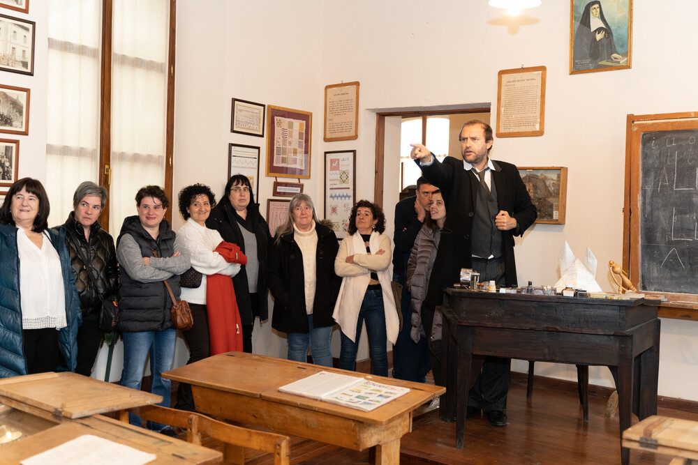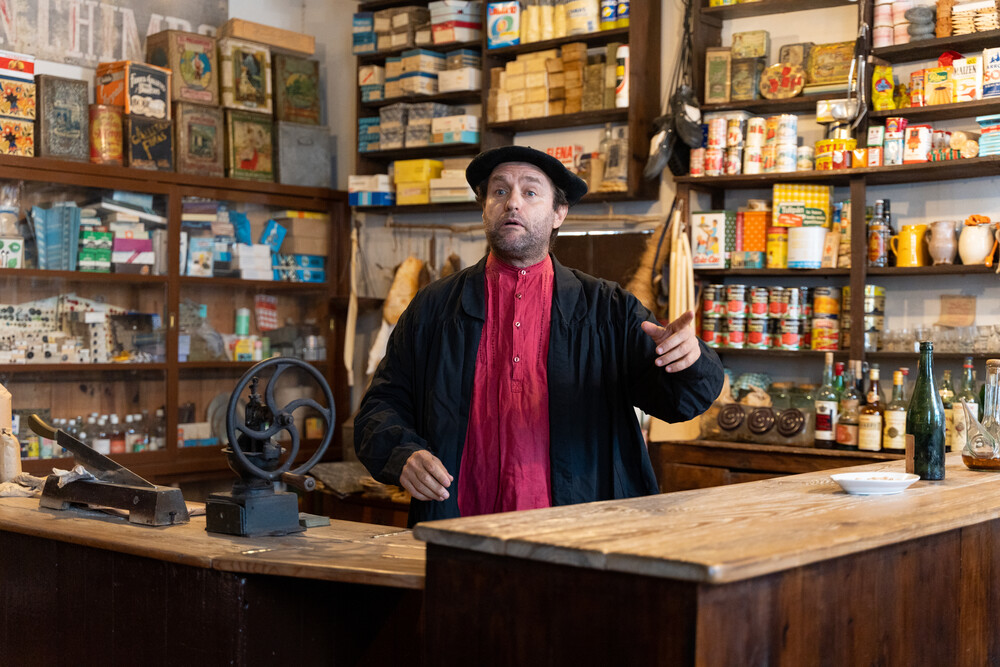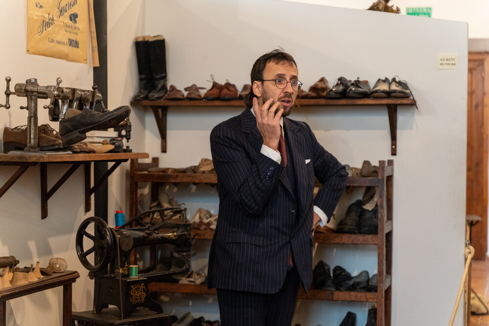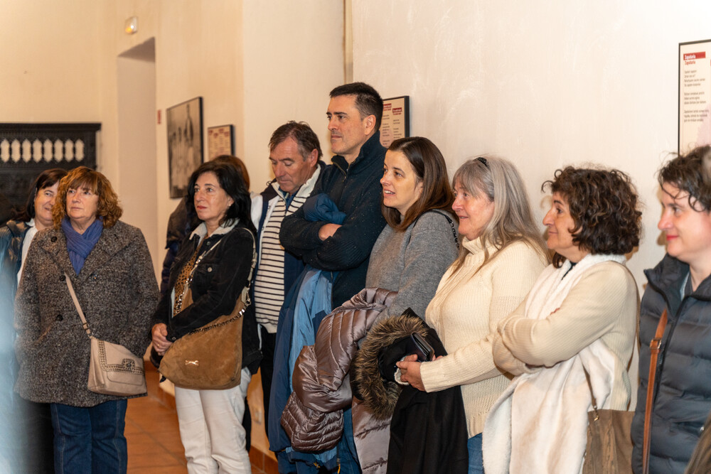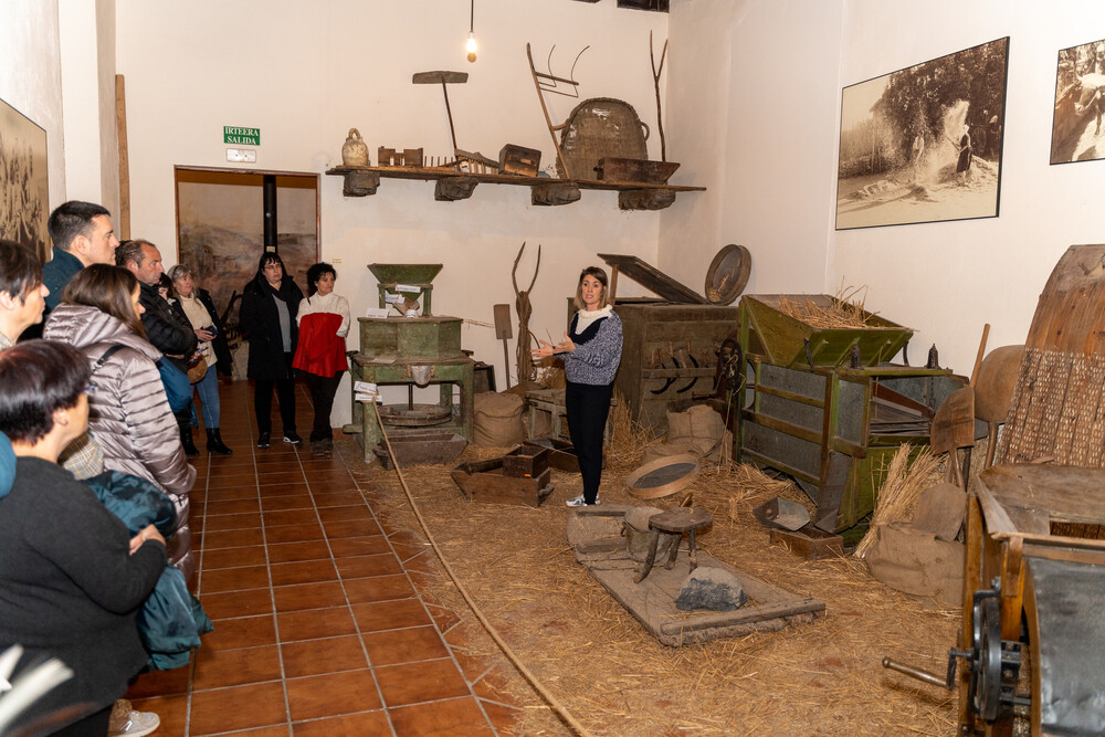 La actividad comenzó con una visita guiada a Artziniega Museoa donde se pudieron ver aspectos de la vida cotidiana del siglo pasado (tienda de ultramarinos-taberna, aula de escuela, farmacia…), y también zonas dedicadas a antiguas profesiones ya casi extinguidas (zapatero remendón, alpargatero, carpintero…), con sus viejos utensilios y máquinas manuales. En el transcurso del recorrido, intervinieron los cómicos de la compañía Arimaktore que amenizaron la visita guiada aportando referencias sobre el txakoli en el Valle de Ayala.