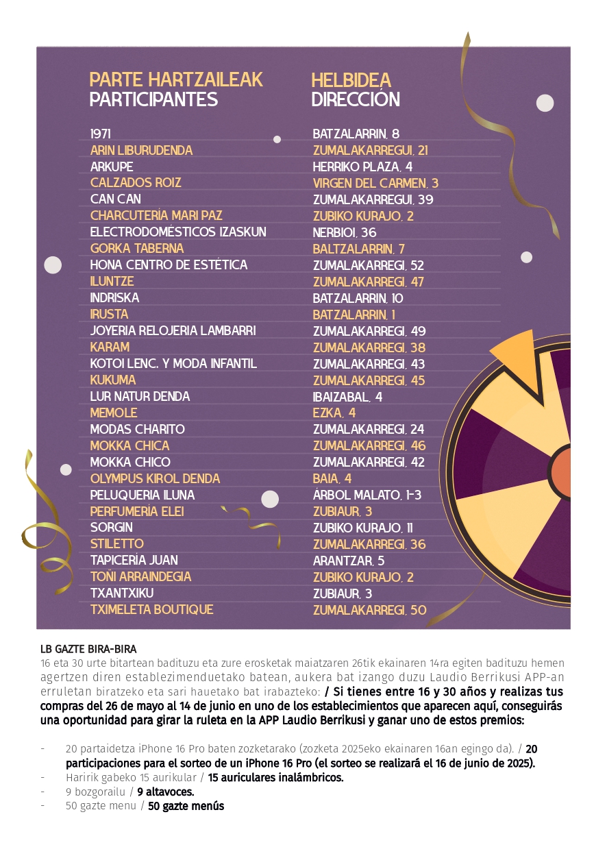 Del 26 de mayo al 14 de junio, solo tienes que comprar en Llodio en uno de los establecimientos participantes y conseguirás una oportunidad para girar la ruleta y conseguir un estupendo premio.